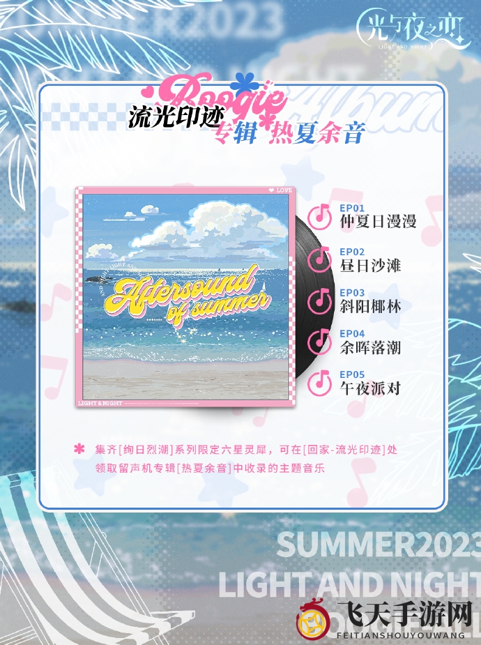 集齐[绚日烈潮]系列限定六星灵犀,可在[回家-流光印迹]处领取留声机专辑[热夏余音]中收录的主题音乐[仲夏日漫漫] [昼日沙滩] [斜阳椰林] [余晖落潮] [午夜派对]。