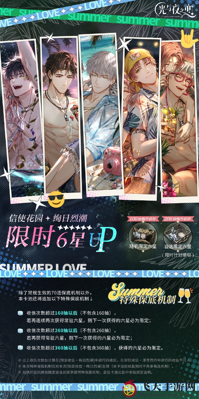 > 活动说明:活动期间将开启[限定收信?绚日烈潮],[6星]灵犀 萧逸?摇曳热浪、[6星]灵犀 陆沉?逃往黄昏、[6星]灵犀 齐司礼?沁入心扉、[6星]灵犀 查理苏?太阳耀斑、[6星]灵犀 夏鸣星?虹时鲸歌 将限时加入卡池并获得概率UP。