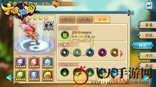 阵营共鸣:根据神兵专属武将的阵营,提供属性加成。游戏中有魏、蜀、吴和群雄四大阵营!