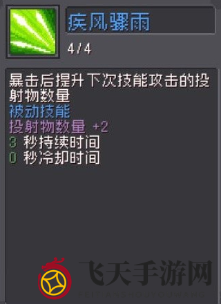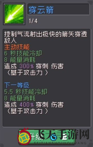 穿云箭,这个技能没有什么亮点,基本上没什么用,既然没什么用,那为什么要点呢,这时候就要说一说弹幕的缺点了,因为弹幕的锁定是在摁下技能的那一刻瞄准怪物,面对高移速的怪时很难打中(巨石山地的符文巨石,这个怪会一直跑),所以这时候就需要这个技能来打伤害了,配合3分裂以及突刺的双倍射击,可以有效的去清怪