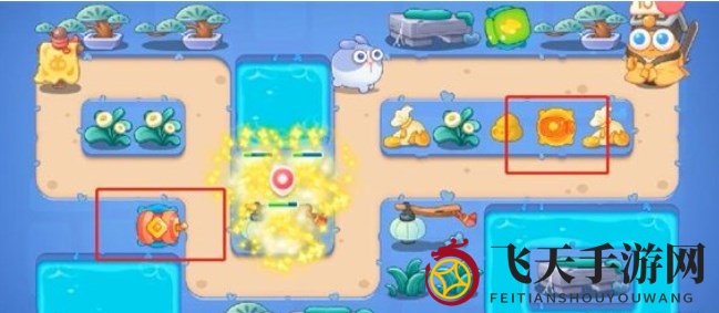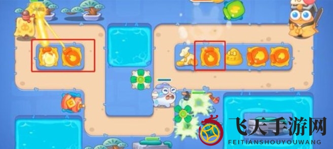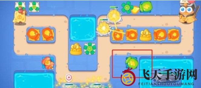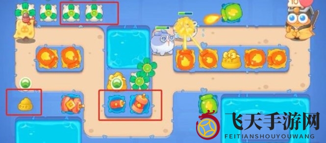 5、第五波敌人出现,在怪口上方增设风扇塔,提升中间风扇塔等级,在右侧安装火炮塔,并在中间加入奶酪提升防御。